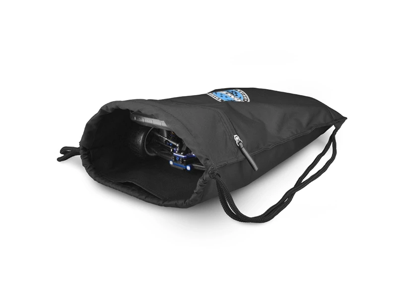 Insert the 1/10th vehicle inside the main compartment on the bag. Pull drawstrings to close the opening to surround the vehicle or items placed inside. Once ready to remove the vehicle, pull the top opening releasing the clinch and the items are visible and ready to go.