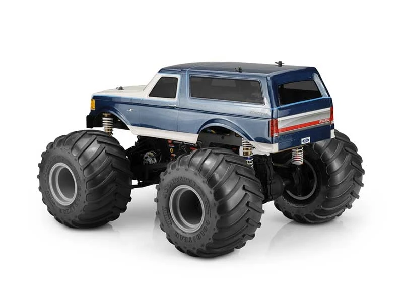 The 1989 Ford Bronco body built and fit for RC monster truck lovers offers first class styling and its exterior is accentuated with a smooth and molded front bumper. The 1989 Bronco carries over the same body style from the previous generation yet sports a new rounded front clip that improves vehicle aerodynamics over its predecessors. The softened body lines around cab which transition to the Bronco’s rear roof seem very seamless and full of vintage grunt. Large fender flares around the wheel wells provide the scale monster truck look and clearance for JConcepts Racing Tires.