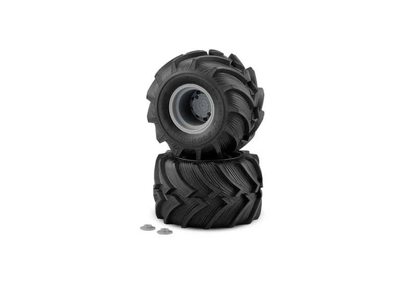 The gnarliest off-road tire is now available pre-mounted for monster trucks. The Fling King created for its popularity in the mud racing game makes an incredibly good tire for the large trucks. In the land of the Megas and Monsters, there is nothing better than a fresh set of deep tread tractor tires. One of the aliases of the mud tires, “Rice and Cane,” refer to the purpose or landscape they were originally designed for within the farming and agriculture industry. The Fling Kings by JConcepts are the first monster truck mud tire pre-mounted and specifically designed to throw mud, dirt, gravel, and grass just like the real thing.
