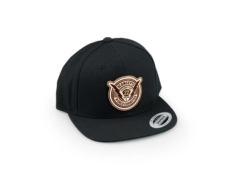 When it comes to the leather patched logo, the lightning bolts release from the center of the design, stirring up quite a bit of emotion. The hard circle boundary allows plenty of flow for branding, factory push, and calendar racing year. Of course, World Champion wording signifies the ultimate success.