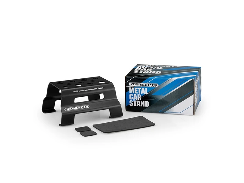 Tough vehicles deserve a rugged and durable stand for the pit area whether it’s at the track or at home. The JConcepts metal car stand is perfect for the 1/8th or 1/10th racer looking to add a little sturdiness to their racing program. The all-aluminum formed and cut piece, designed by JConcepts, has a unique shape, cut-outs for handles and features laser etched logos for identification. The item stands tall and keeps the wheels off the ground for an array of vehicles.