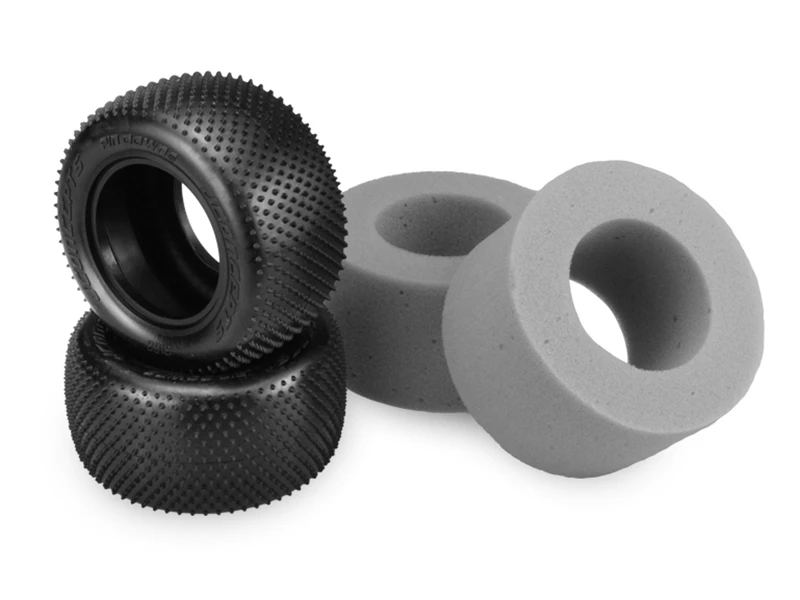 The tire carcass itself has been refined to reduce weight while maintaining strong sidewall support. The pink compound marked with 2 pink dots on the tire represents a new compound for JConcepts, a medium soft material with good wear characteristics. The rear tires include gray, open cell inserts making them a complete set ready to mount, straight out of the package. The Pin Downs work best on Carpet and Astroturf tracks where typically a small pin tire is working.