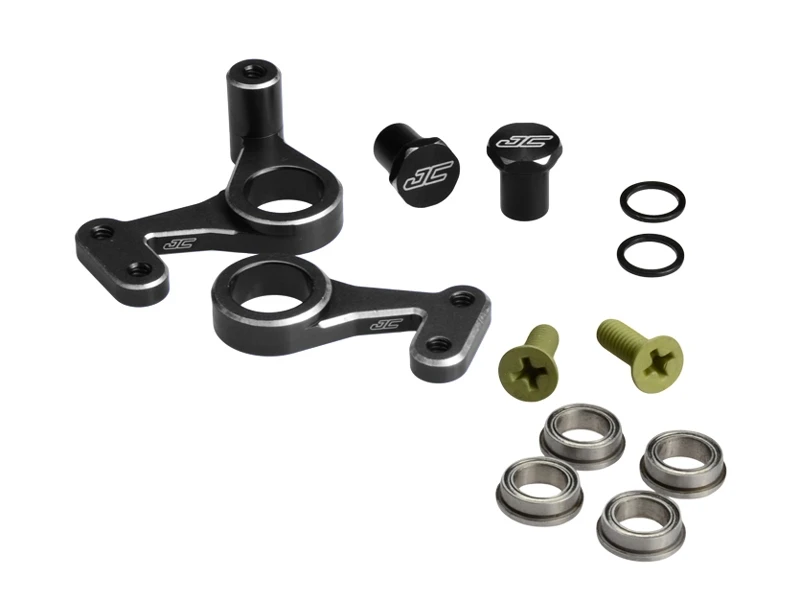 One of the best hop-ups that can be made to the RC10 is to update the steering bell-cranks with a more durable design. JConcepts has evaluated the options and built an all aluminum design bringing the driving bell-crank into a one-piece design eliminating the servo saver, increasing steering response and feel. The idler bell-crank sports a beefy and similar design giving the vehicle a symmetrical feel. The parts are available in blue or black and feature silver chamfered edged highlighting and laser-etched JC logo for brand authenticity. The bell-cranks are bearing supported with heavy-duty flanged bearings and include threaded aluminum steering posts with etched JC logo for an ultra snug fit and finish.